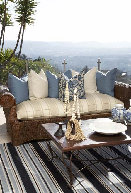 Existing outdoor sofas and chairs can be bought instantly to life by simply adding a few scatter cushions. The trick is not to be to skimpy, layering with two different styles, a plain and a pattern in contrasting matching colours, keeping the tones the same.