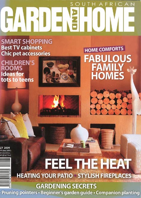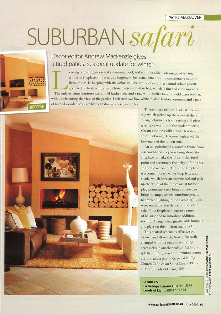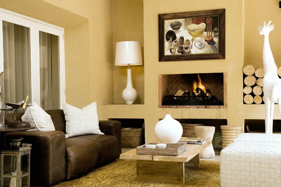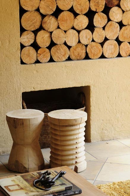 An old painting in a wooden frame from a second-hand shop was hung above the fireplace to make the most of this focal point and accentuate the height of the area. In the alcove on the left of the fireplace is a contemporary white lamp base and shade, which have an organic feel and pick up the white of the ottomans. (outdoor plug points are a real bonus as you can bring lamps, which contribute greatly to ambient lighting in the evenings.) Logs were stacked in the alcove on the other side of the fireplace to create a sense of balance and to introduce additional texture. A large white giraffe adds humour and plays on the modern safari feel.