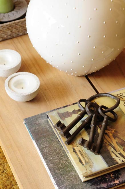 This neutral scheme is effective on its own and allows the look to be easily changed with the seasons by adding accessories in another colour. Adding a splash of lime green are a textured scatter cushion and pair of Green Wild Fig Church Candles on Stone Candle Plates, all from Loads of Living.