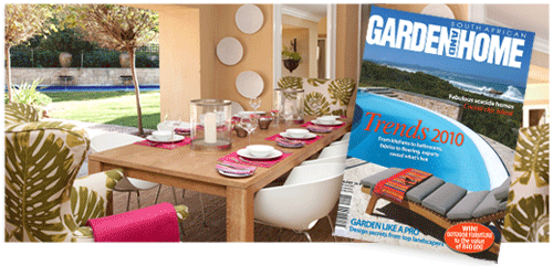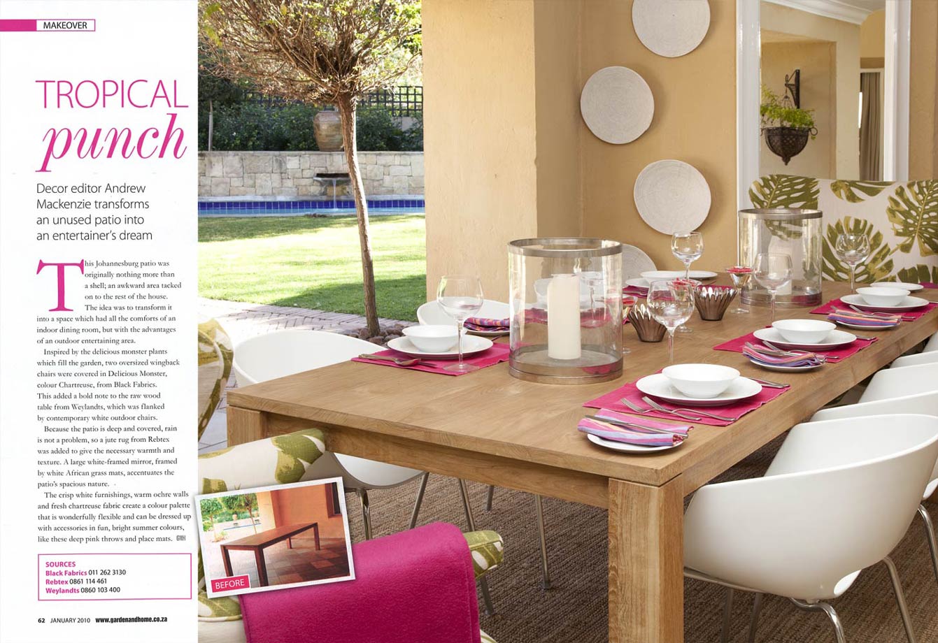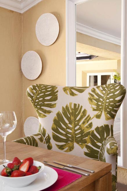 Inspired by the delicious monster plants which fill the garden, two oversized wingback chairs were covered in Delicious Monster, colour Chartreuse, from Black Fabrics. This added a bold note to the raw wood table from Weylandts, which was flanked by contemporary white outdoor chairs. Because the patio is deep and covered, rain is not a problem, so a jute rug from Rebtex was added to give the necessary warmth and texture. A large white-framed mirror, framed by white African grass mats, accentuates the patio’s spacious nature.