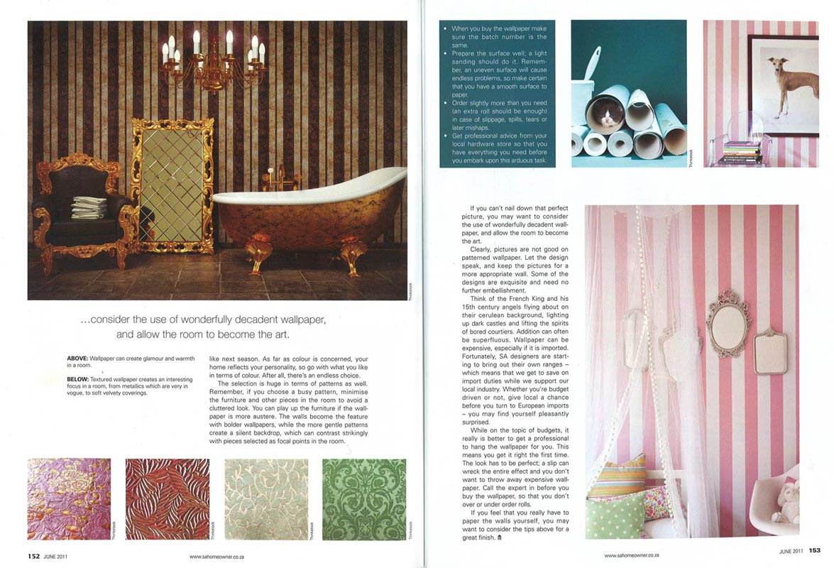 Think of the French King and his 15th century angels flying around on their cerulean background, lighting up dark castles and lifting the spirits of bored courtiers. Addition can often be superfluous. Wallpaper can be expensive, especially if it is imported. Fortunately, SA designers are starting to bring out their own ranges – which means that we get to save on import duties while we support out local industry. Whether you’re budget driven or not, give local a chance before you turn to European imports – you may find yourself pleasantly surprised.