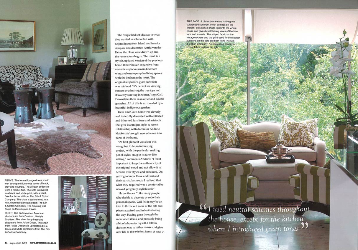 He continues: “Like many people who decide to decorate or redo their personal spaces, Gail felt it may be an idea to throw out some of the bits and pieces acquired and inherited along the way. Having gone through the mentioned items, and probably being a bit of a hoarder myself, I felt the decision was to rather re-use and give new life to existing items. A new and interesting fabric can do miracles and by simply paying respect to scale and proportion, shifting and changing objects and furniture around can immediately give a space a new and interesting feel.